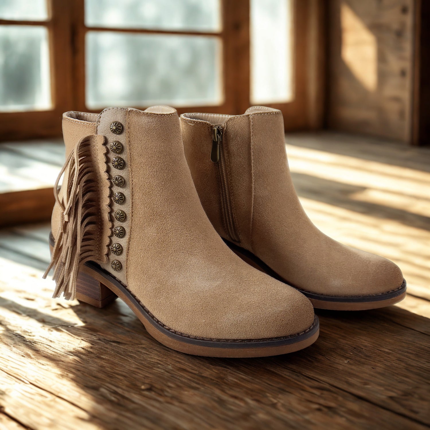 Añade un toque bohemio y chic a tu vestuario con estos encantadores botines de media caña. Perfectos para looks casuales, festivales o para darle un aire effortlessly cool a tus jeans favoritos.