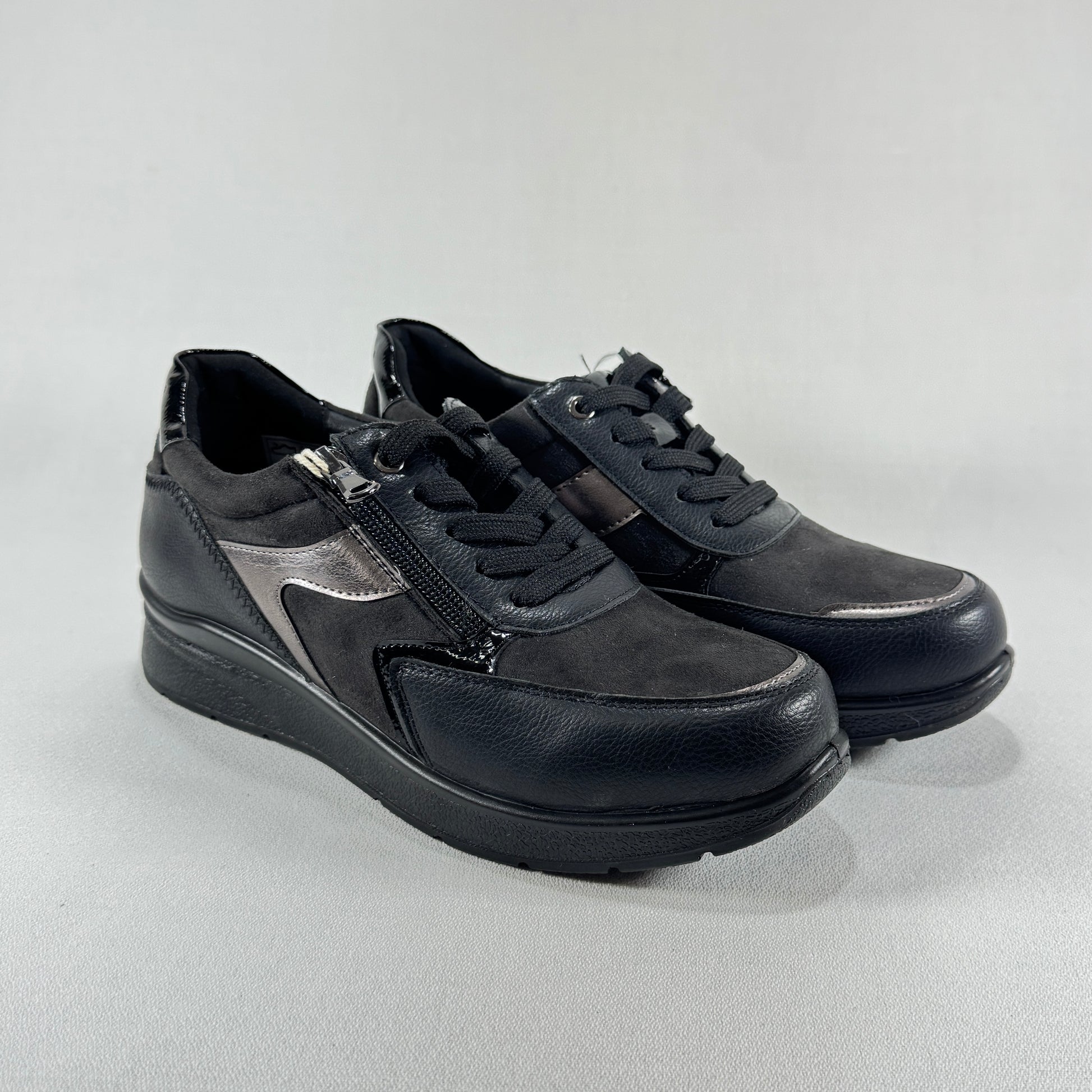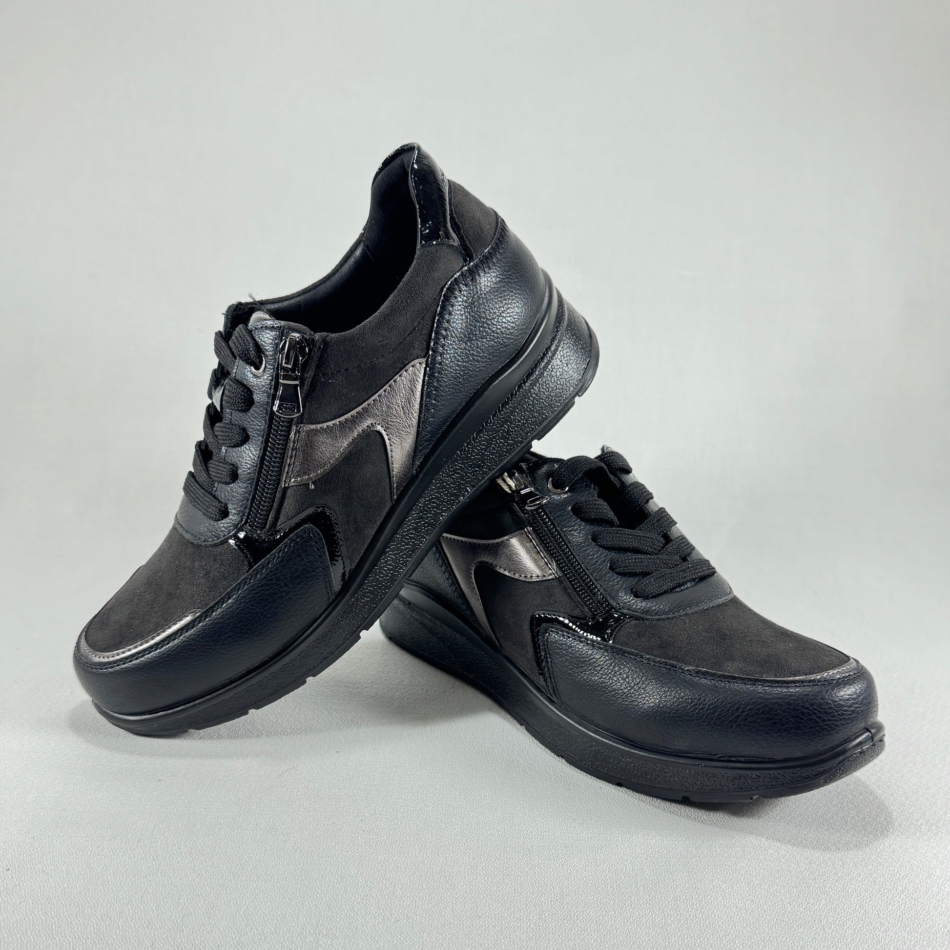 Fabricadas con una combinación de materiales de alta calidad, estas zapatillas presentan un diseño en tonos negros y detalles plateados. Su cremallera lateral te permite ponértelas y quitártelas de forma rápida y sencilla, mientras que los cordones te aseguran un ajuste perfecto.