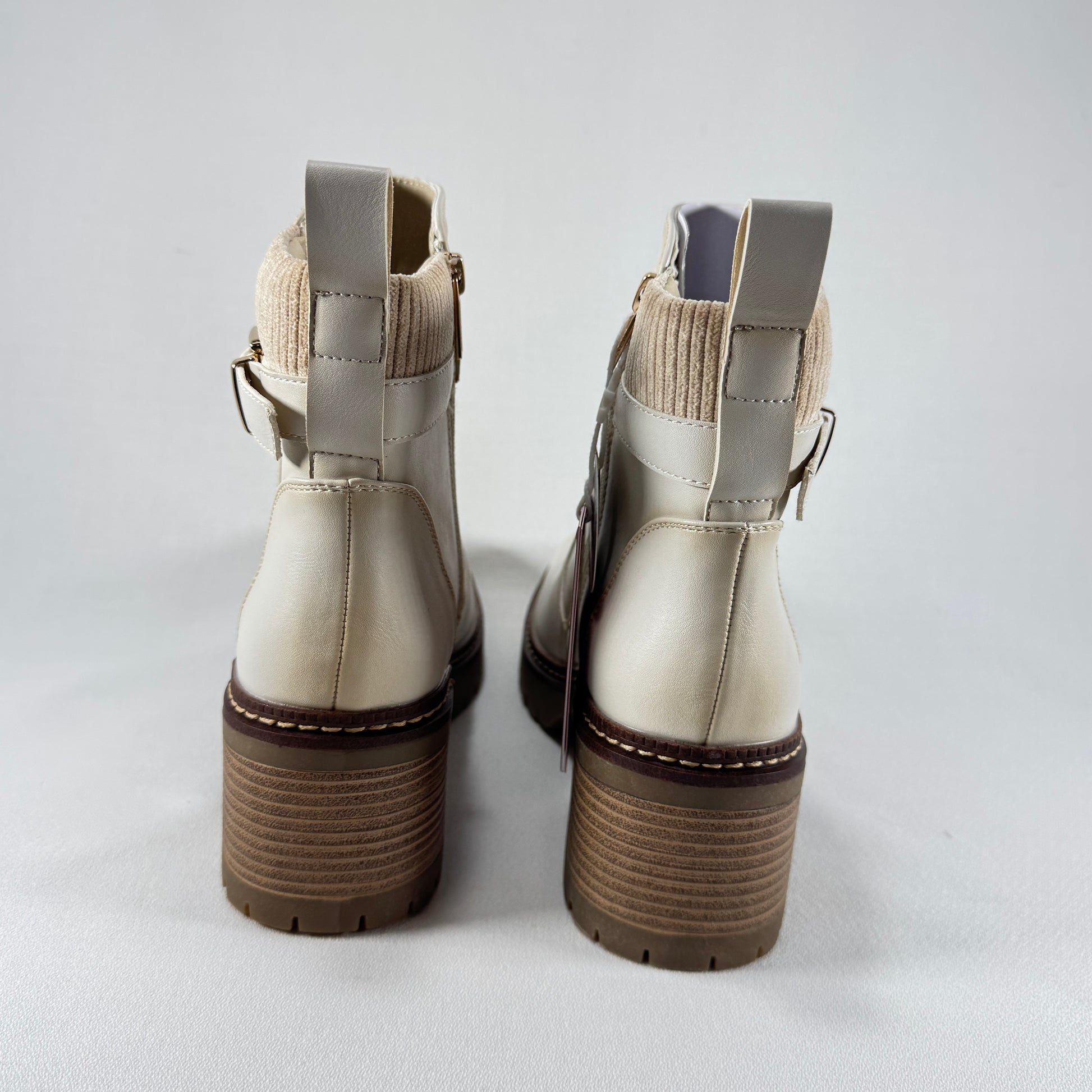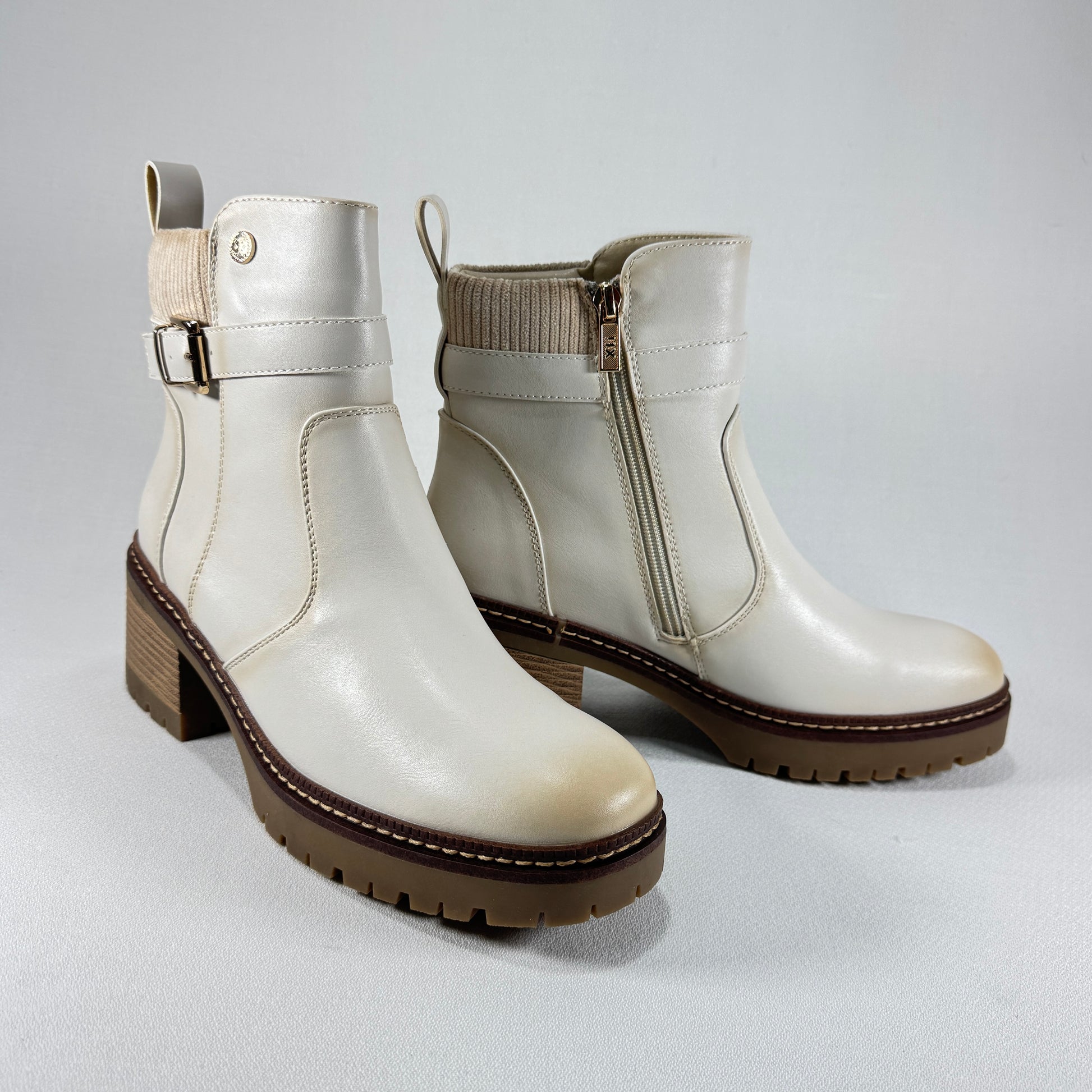 Añade un toque de luz y estilo a tus pasos con estos botines en tono crema. Su diseño combina la robustez de la suela de combate con una paleta de colores suaves y sofisticados, perfectos para combinar con tonos tierra o mezclilla.