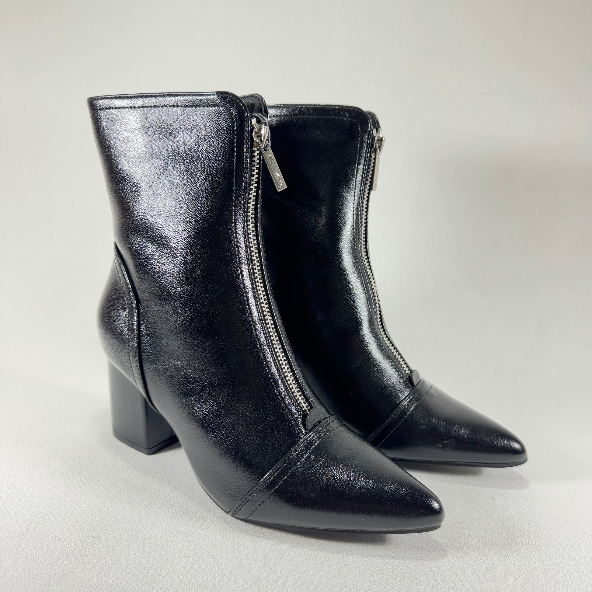 Diseño Vanguardista: Cuentan con un elegante cierre de cremallera frontal plateada que no solo es un detalle distintivo, sino que facilita el calce. La puntera afilada y el tacón robusto y de altura cómoda (aproximadamente de 5 a 7 cm) ofrecen una silueta chic y moderna.