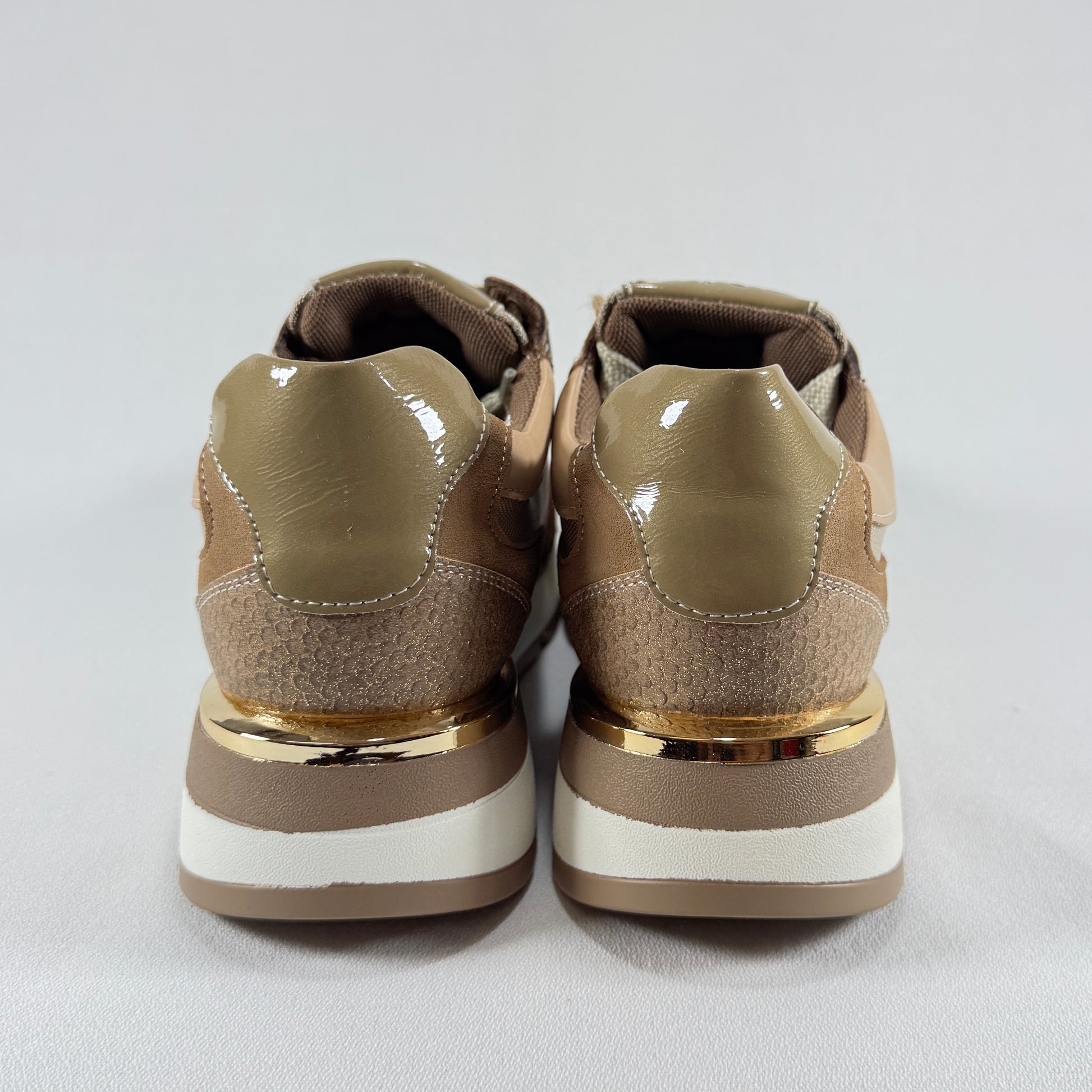 Descubre el equilibrio perfecto entre sofisticación y confort con estos tenis casuales "D'Angela". Su diseño en tonos tierra, combinando gamuza, tela transpirable y detalles metálicos en color dorado, te ofrece un look versátil y lleno de estilo. La suela de doble tono no solo proporciona una pisada estable y ligera, sino que también complementa a la perfección la estética moderna del calzado.