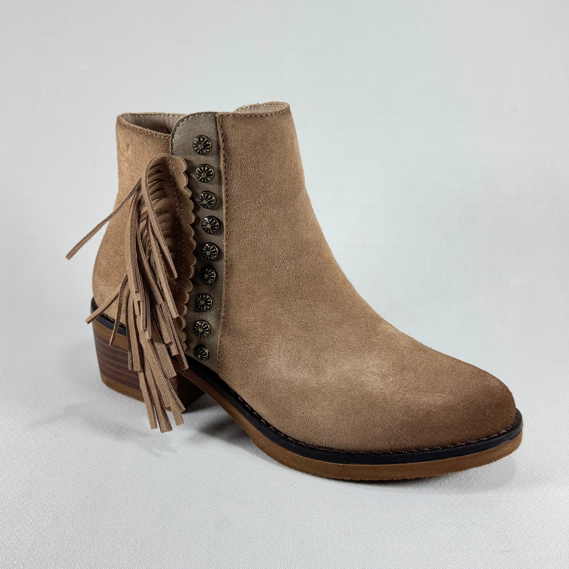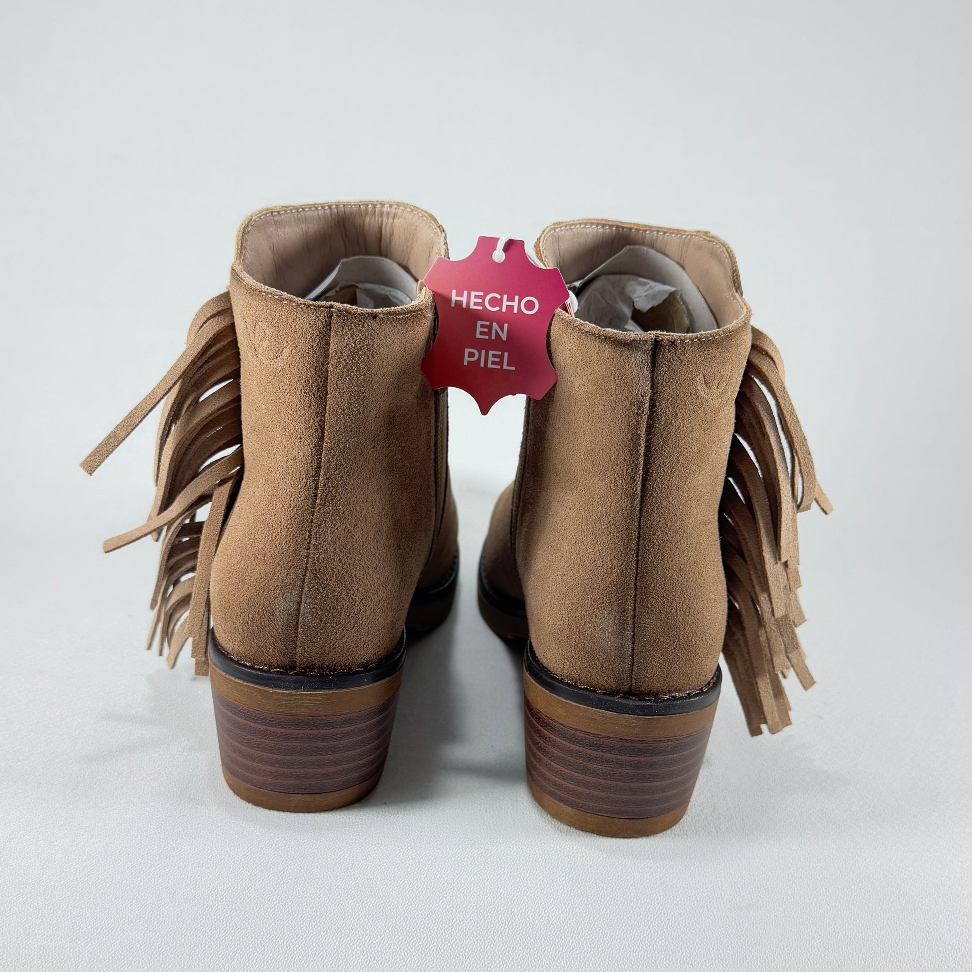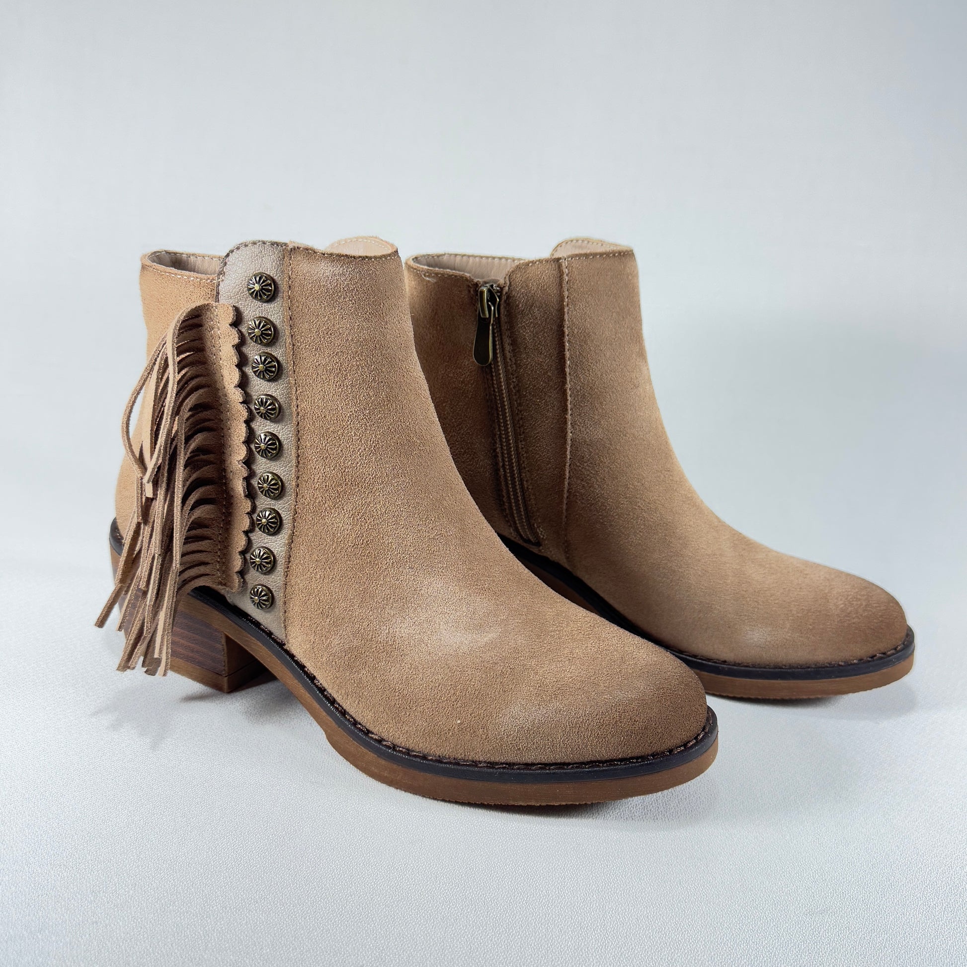 Detalles Únicos: Estos botines destacan por su vibrante estilo western / boho. Presentan un panel lateral adornado con flecos y elegantes apliques metálicos de estilo envejecido (conchos), que les dan un carácter auténtico y llamativo.