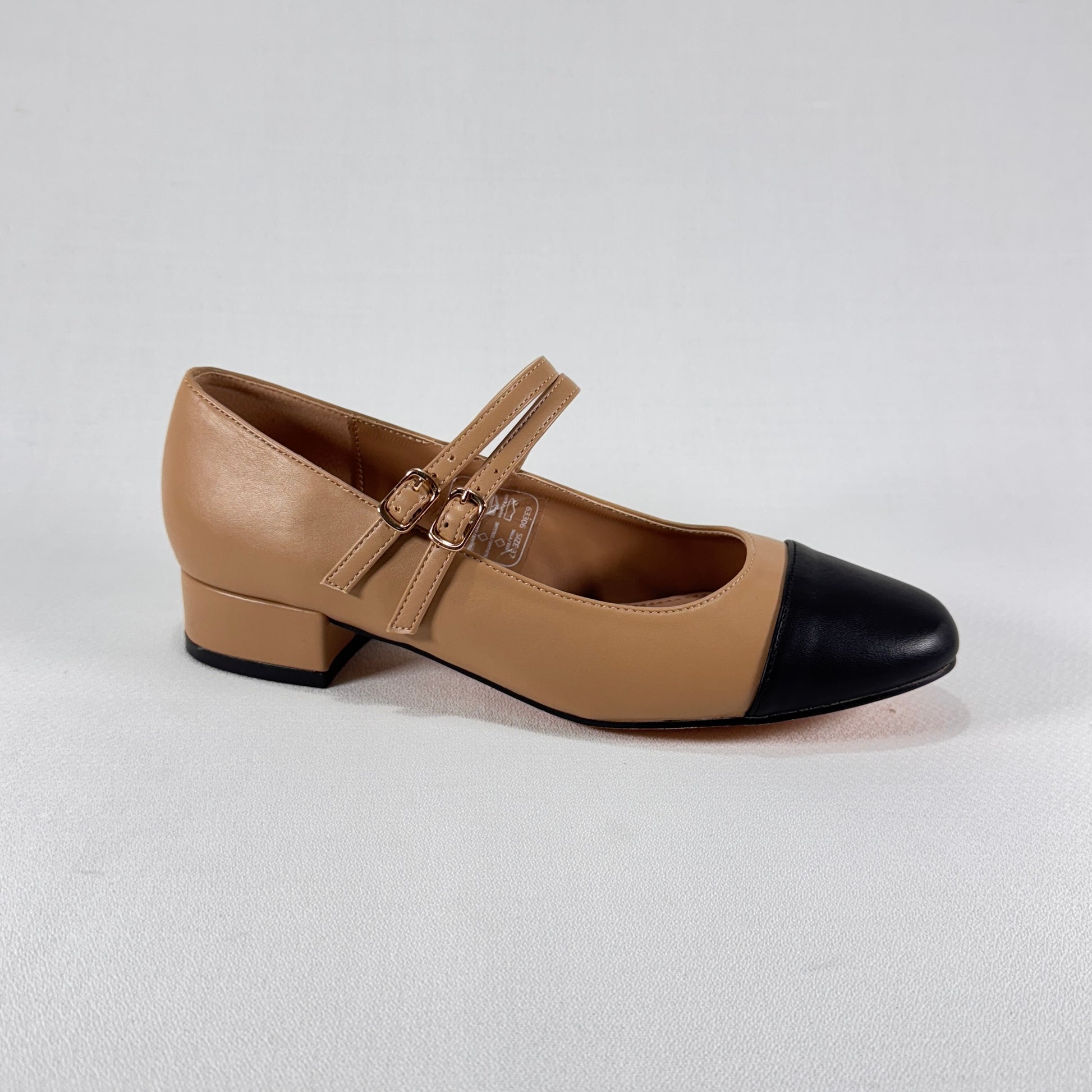 Elaborado con materiales de alta calidad, este modelo presenta la combinación cromática más chic: un elegante tono Beige (Nude/Camel) que alarga visualmente la pierna y una puntera en contraste de Negro que estiliza el pie. Las dos finas tiras ajustables sobre el empeine, adornadas con delicadas hebillas doradas, aseguran no solo un ajuste impecable, sino también ese toque femenino y retro tan codiciado.