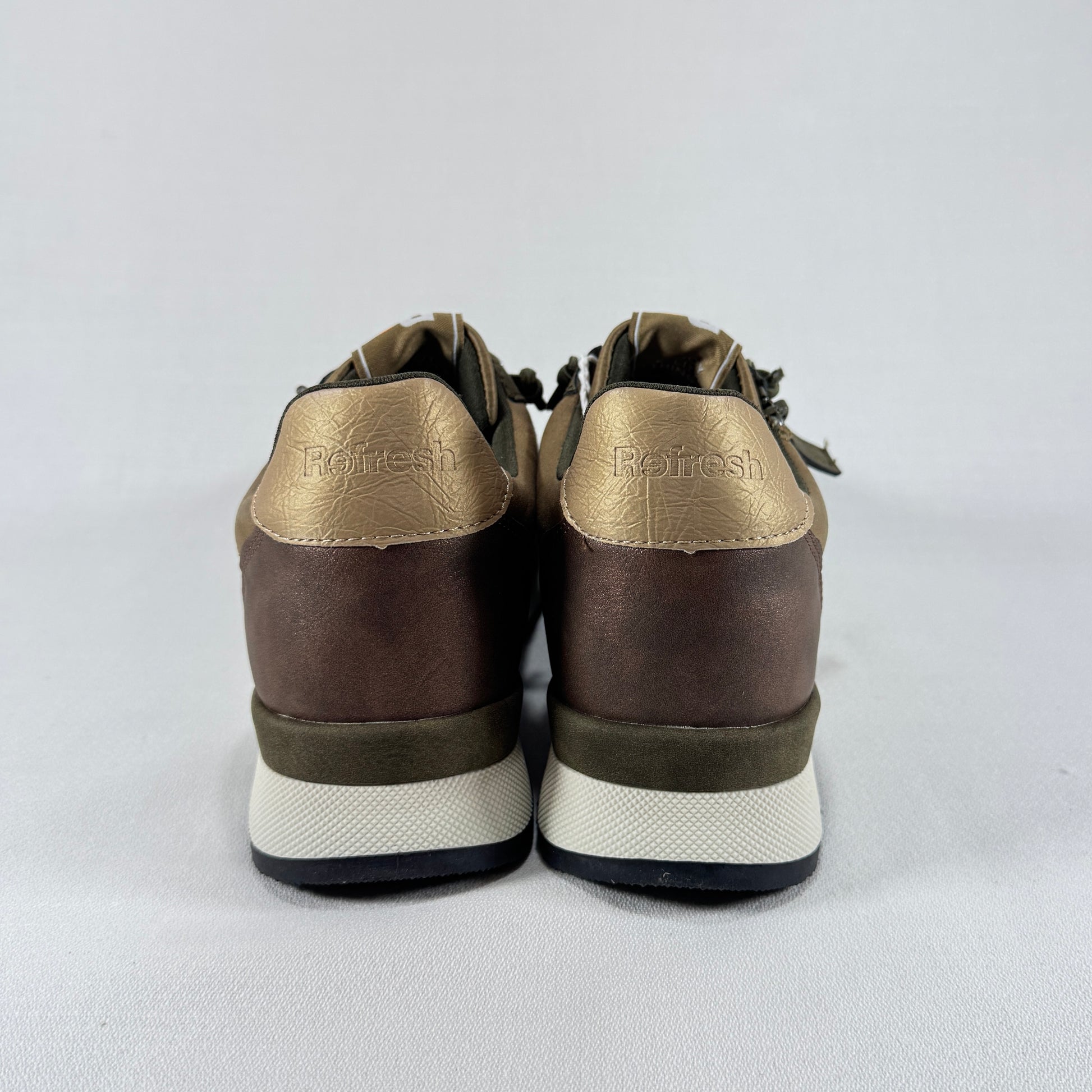 Fabricadas con una mezcla de materiales en tonos verde militar, dorado y detalles de imitación de piel de serpiente, estas zapatillas destacan por su cremallera lateral, que te permite ponértelas y quitártelas de forma rápida y sencilla. Los cordones a juego complementan el diseño, aportando un ajuste perfecto.