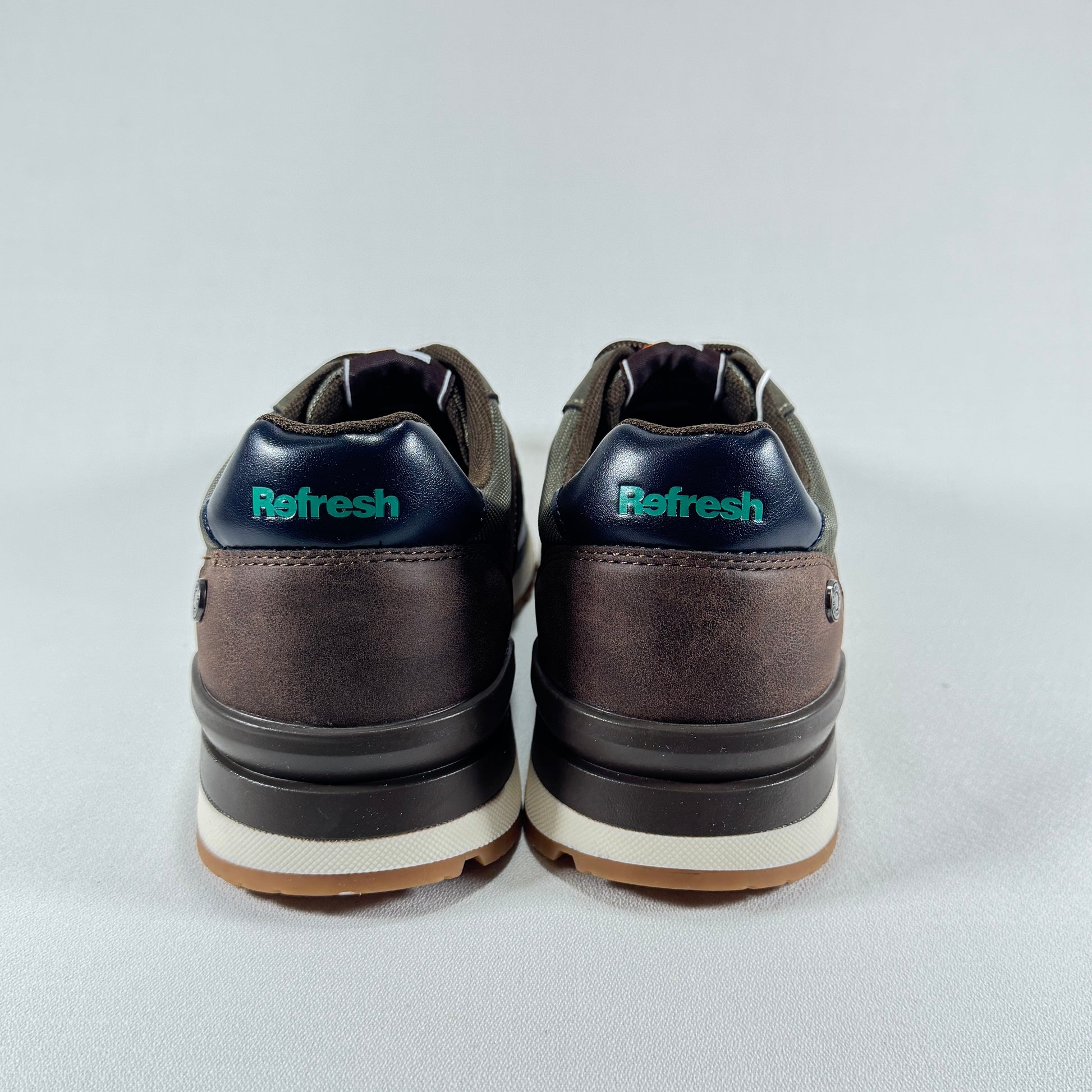 Descubre la combinación perfecta de diseño robusto y comodidad excepcional con estos tenis casuales. Su elegante diseño en tonos marrón y verde militar, con detalles de costuras y texturas, los convierte en el calzado ideal para cualquier aventura urbana. La suela de doble tono no solo aporta estabilidad, sino que también completa su estética moderna.