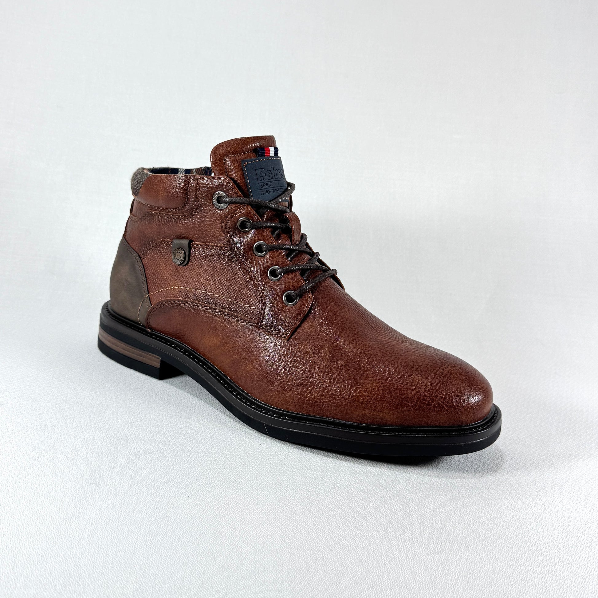 Descubre la elegancia robusta de estos botines de cordones en un cálido tono marrón coñac. Con un acabado texturizado que simula la piel, son el calzado perfecto para el hombre que busca estilo, durabilidad y máxima comodidad para sus looks de temporada.