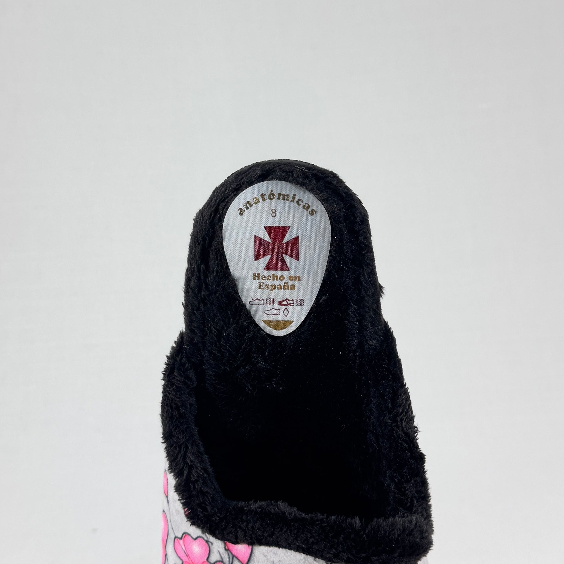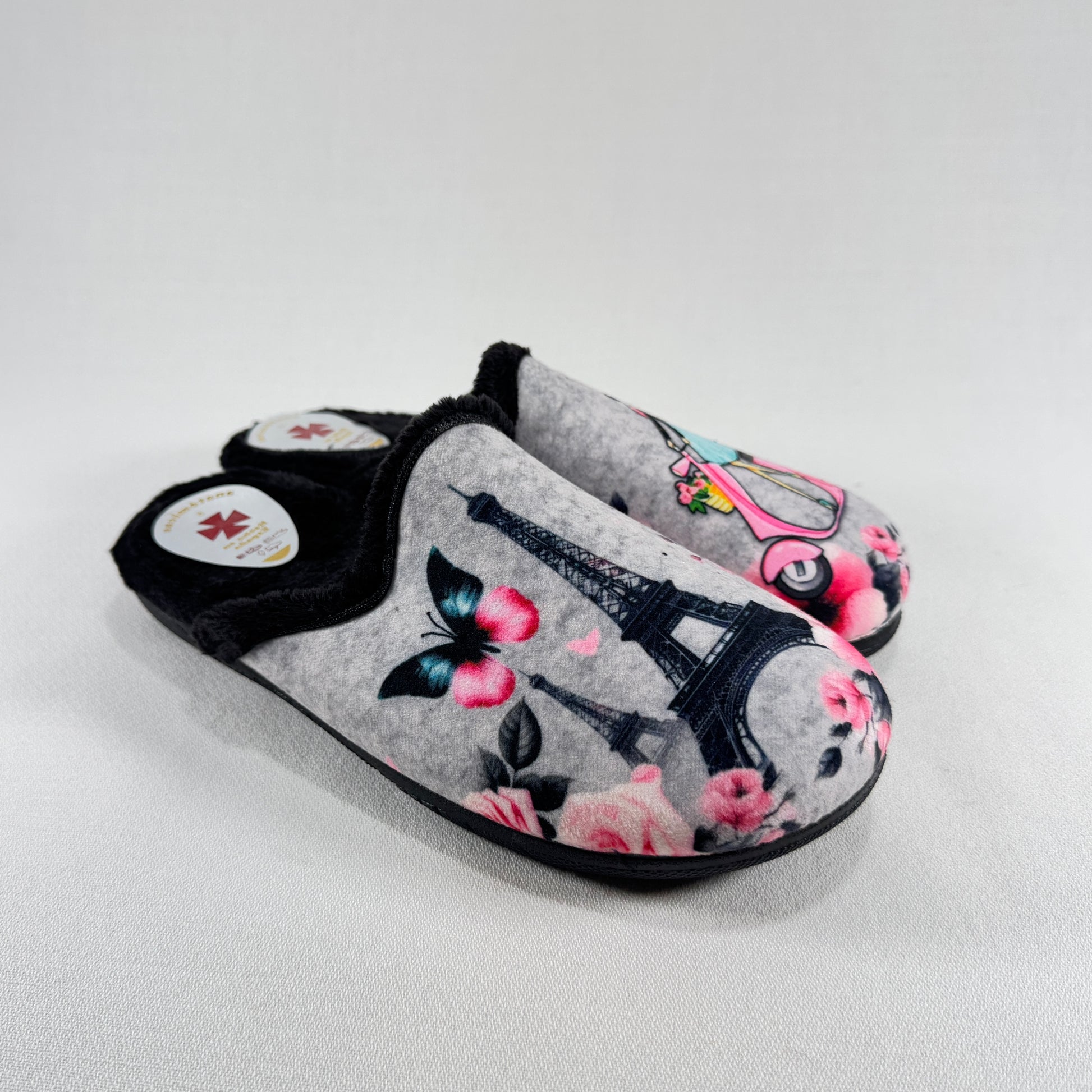 Estilo y Tendencia: El diseño destalonado tipo mule es fácil de poner y quitar. El tejido de base gris se adorna con un vibrante estampado de inspiración parisina y toques florales: una moto de estilo Vespa con una chica elegante en un pie, y la silueta de la Torre Eiffel con mariposas en el otro. El ribete de pelo negro añade un extra de calidez y sofisticación.